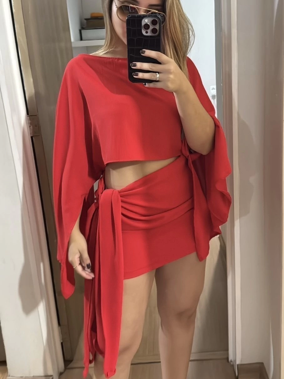 Conjunto no tecido duna air flow composto por 2 peças, uma saia de amarrar (ajustável no corpo) com elástico no cós pra melhor caimento. Blusa curta com mangas amplas e fluidas. Peça não possui forro, deve ser usada com um sutiã ou top por baixo! indicamos o sutiã tomara que caia, foi usado nessas fotos e está disponível aqui no site 💗